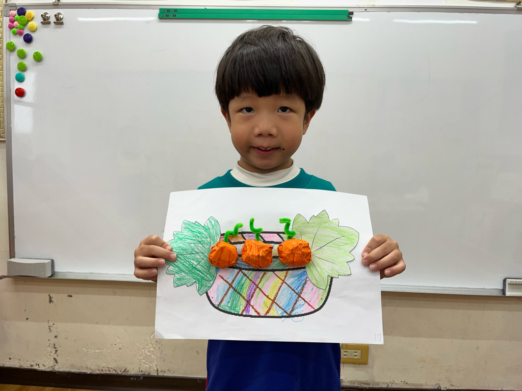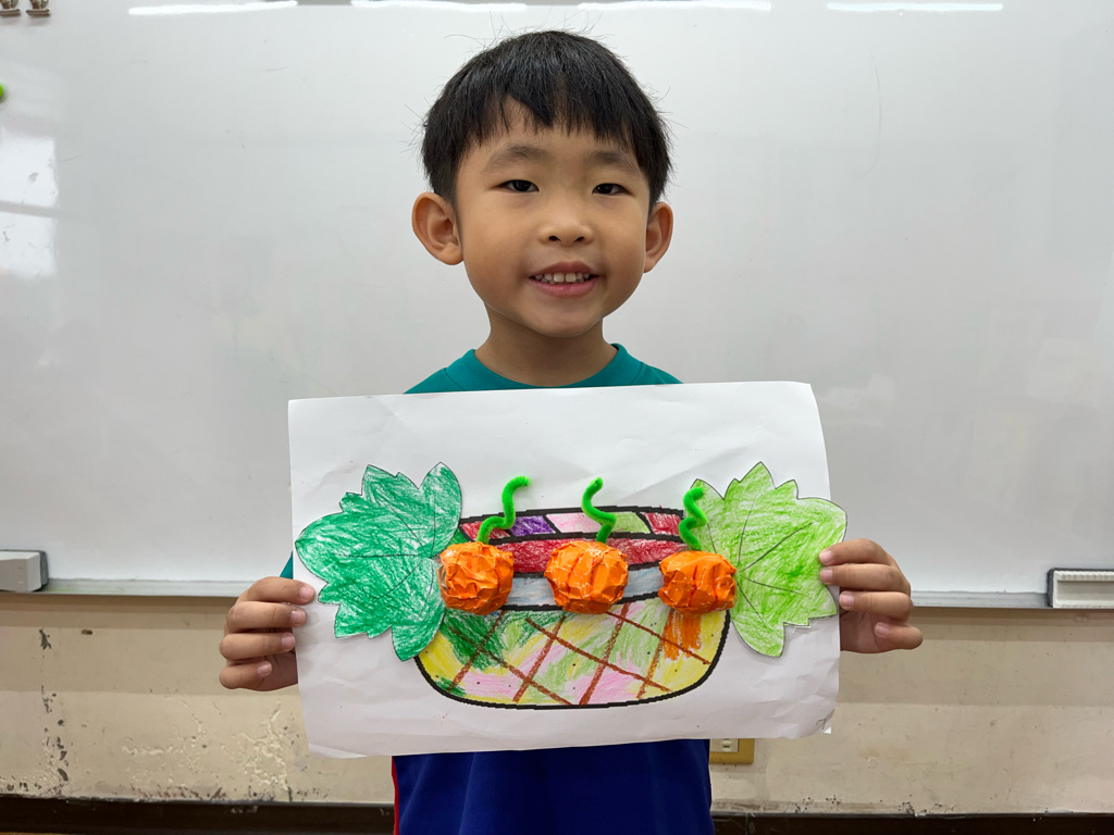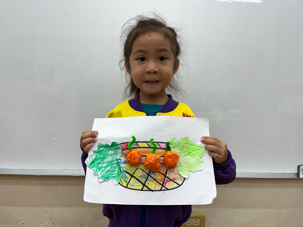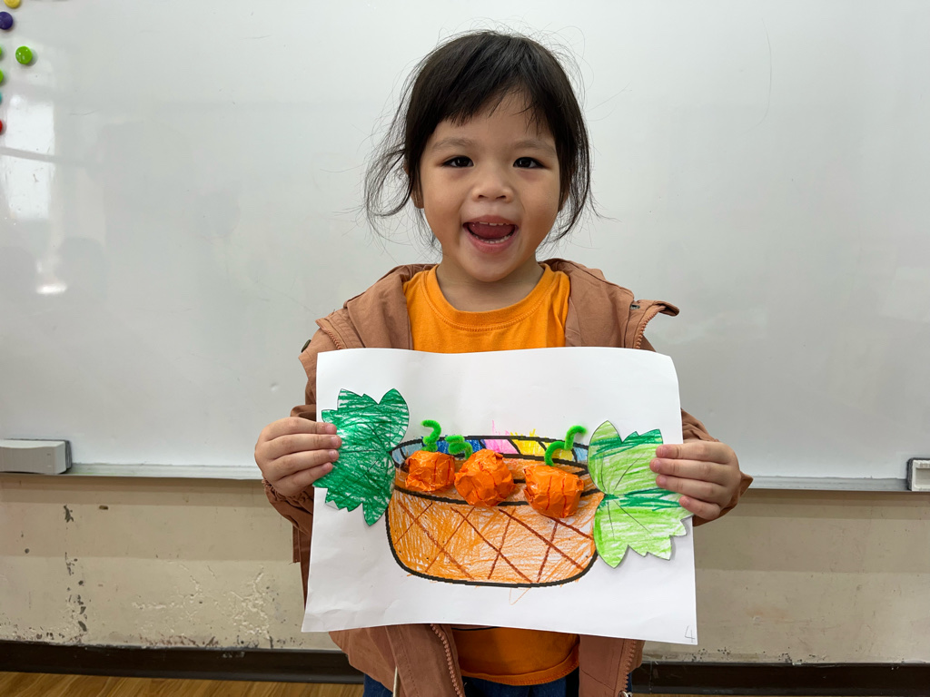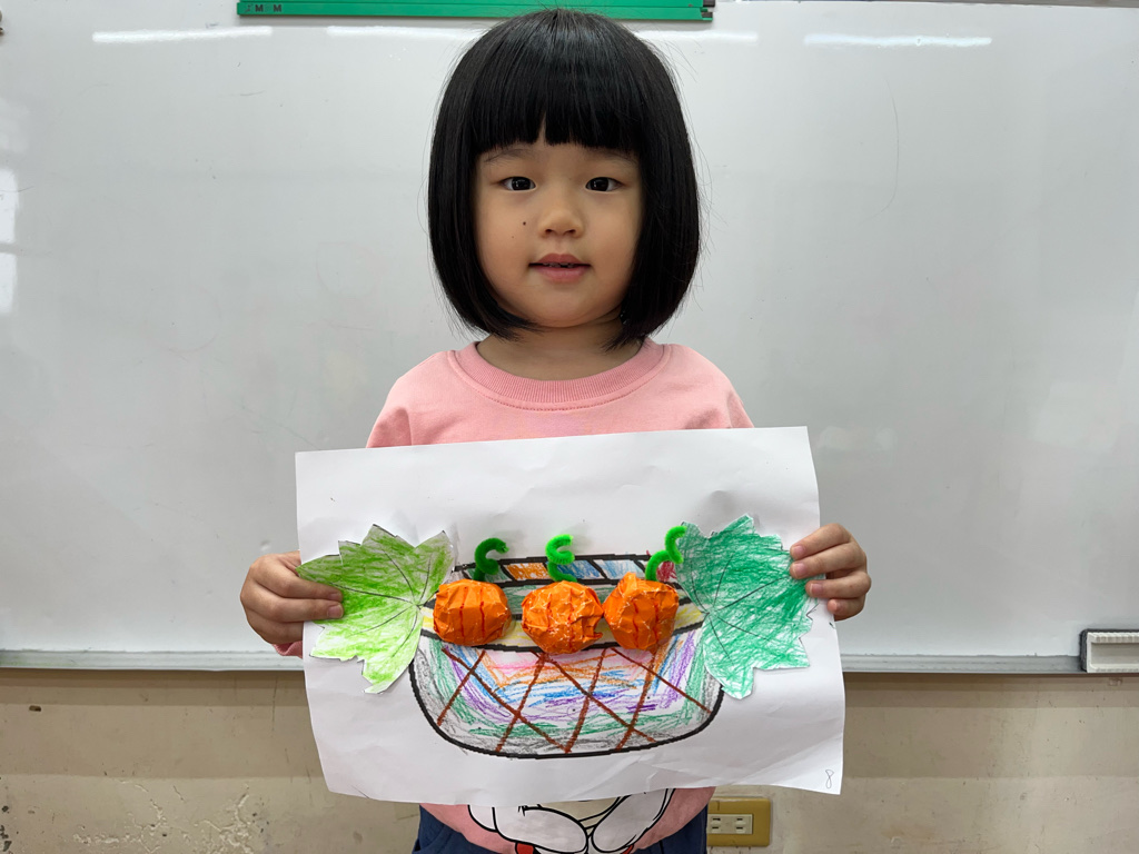 孩子認識秋天生長的蔬菜-南瓜🎃,並動手利用廢紙揉成圓球狀,外面包上橘色的色紙,上面再加上用毛根做成的蒂頭,南瓜就完成了😊再請孩子貼在收成的籃子裡噢☺️