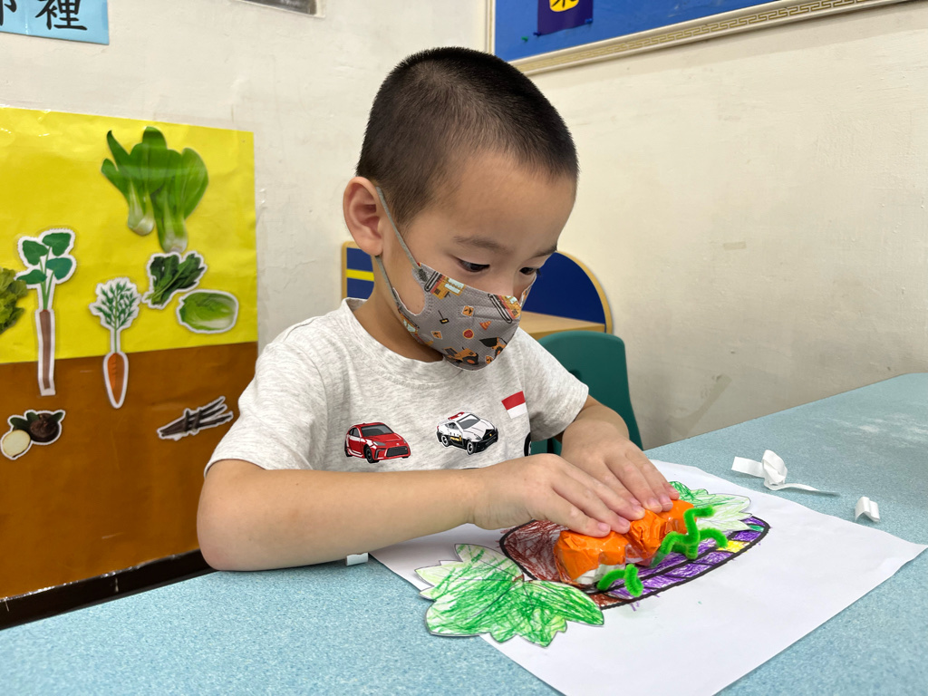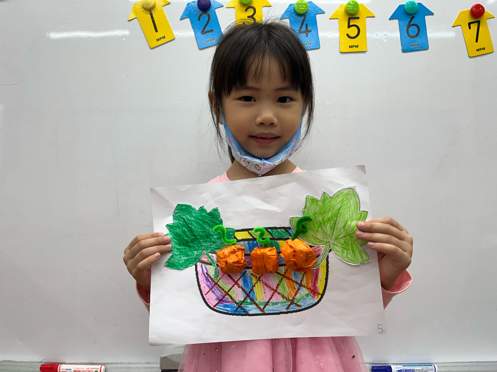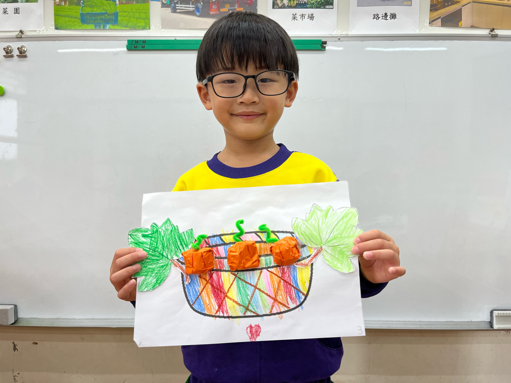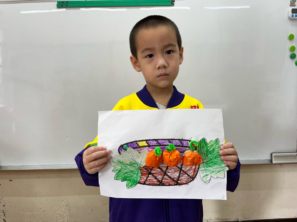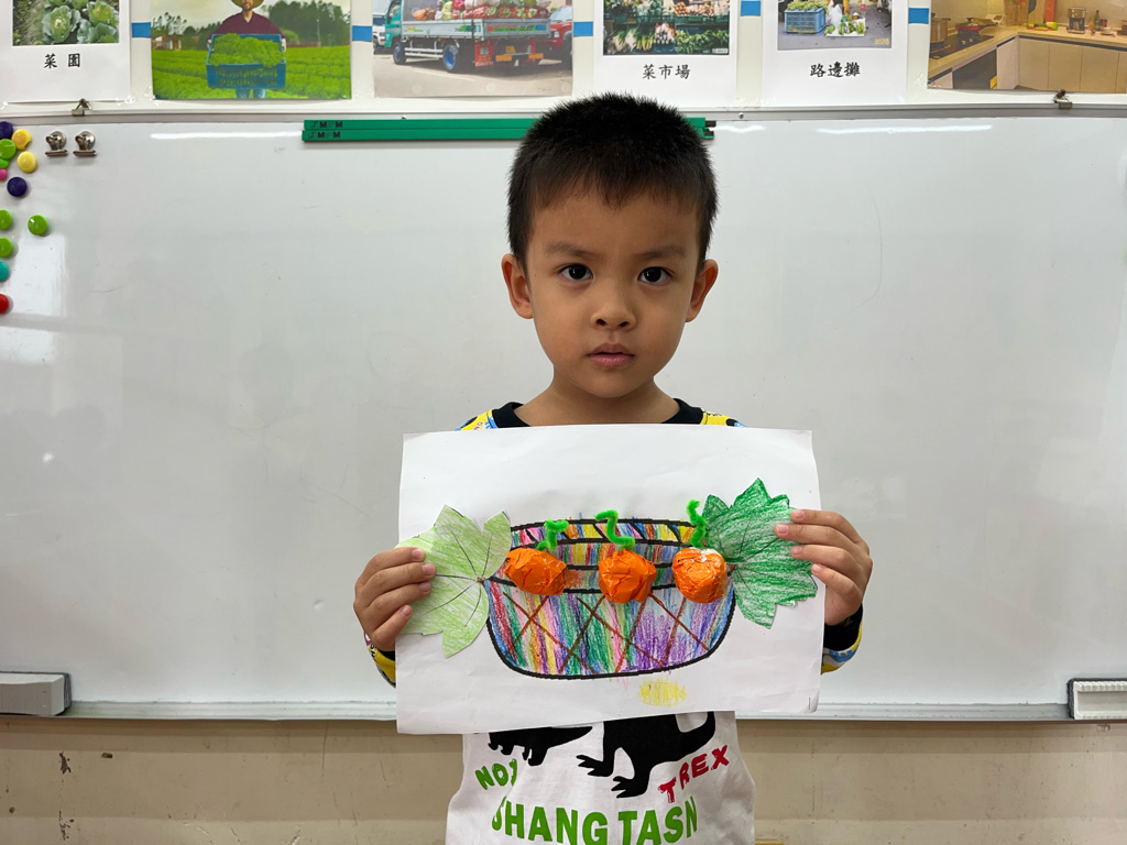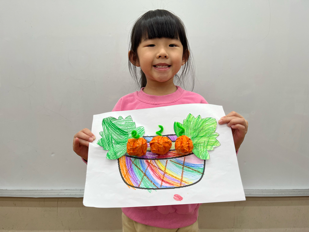 孩子認識秋天生長的蔬菜-南瓜🎃,並動手利用廢紙揉成圓球狀,外面包上橘色的色紙,上面再加上用毛根做成的蒂頭,南瓜就完成了😊再請孩子貼在收成的籃子裡噢☺️